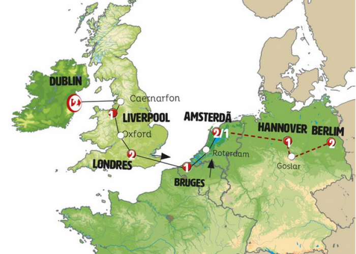 9 dias passando por Dublin, Caernarfon, Liverpool, Sttratford, Oxford, Londres, Canterbury, Bruges, Gante, Middelburg, Roterdã, Amsterdã.