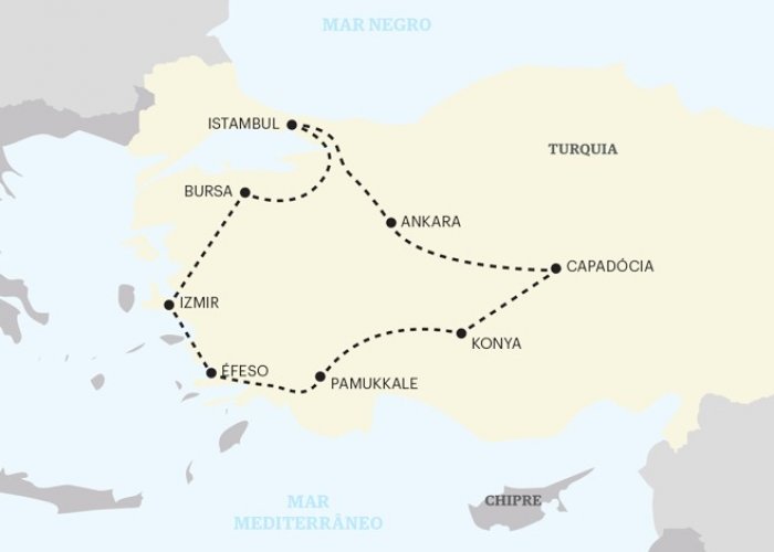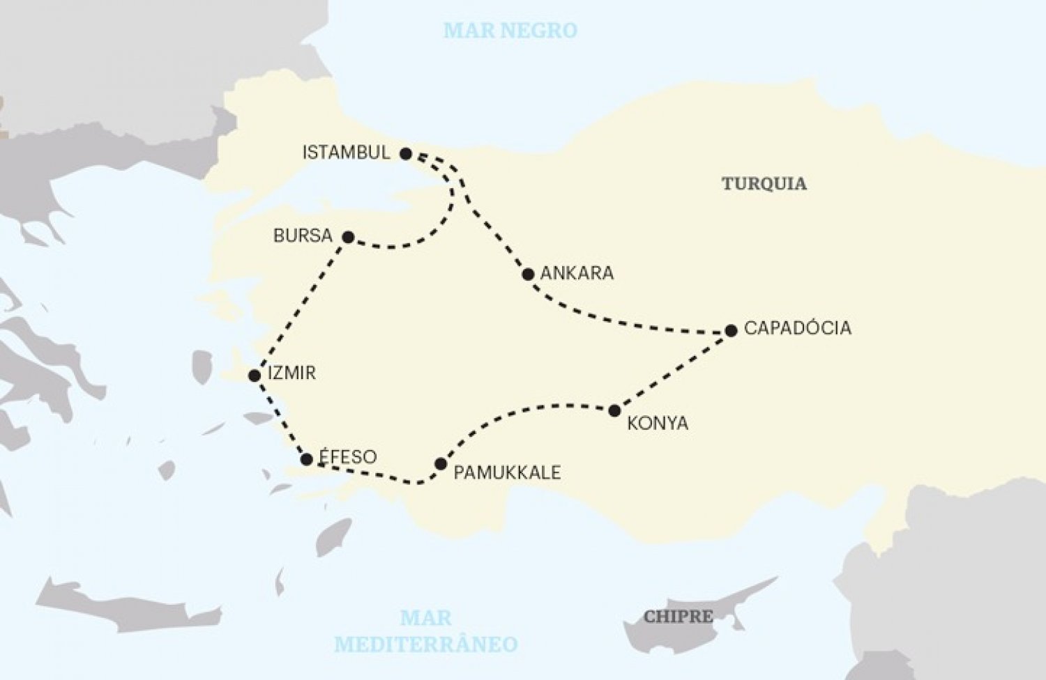 10 dias e 9 noites, visitando Istambul, Ankara, Capadócia, Konya, Pamukkale, Éfeso, Izmir ou Kusadasi, Bursa.